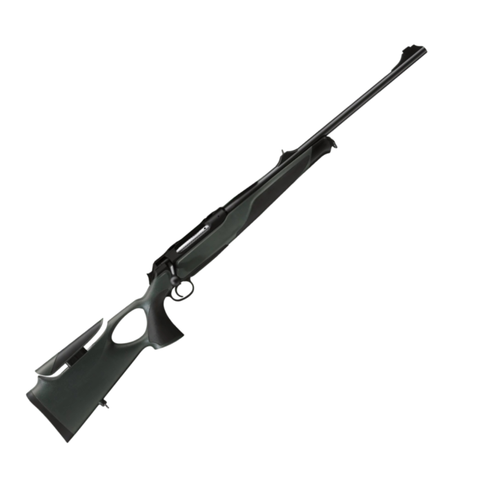 Fusil Sauer modelo S404 Syncro XT. Made in Alemania. Calibre .30-06 SPRG. Acción a cerrojo. Cañón Heavy de 560 mm de largo, con alza y guion. Capacidad del cargador 2 (opcional 4). . Culata Synchro XT, con Thumbhole. El retroceso del arma es mínimo y muy confortable de disparar. Peso estimado 3380 gramos.