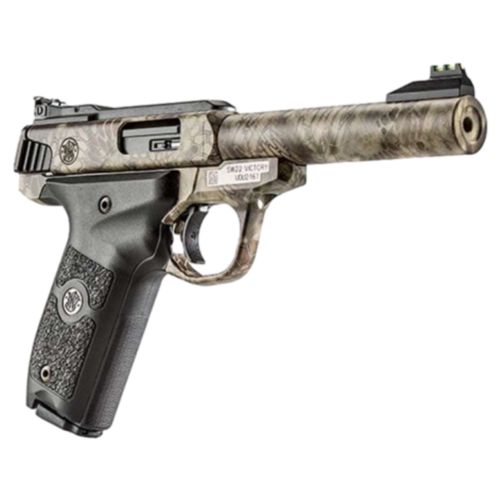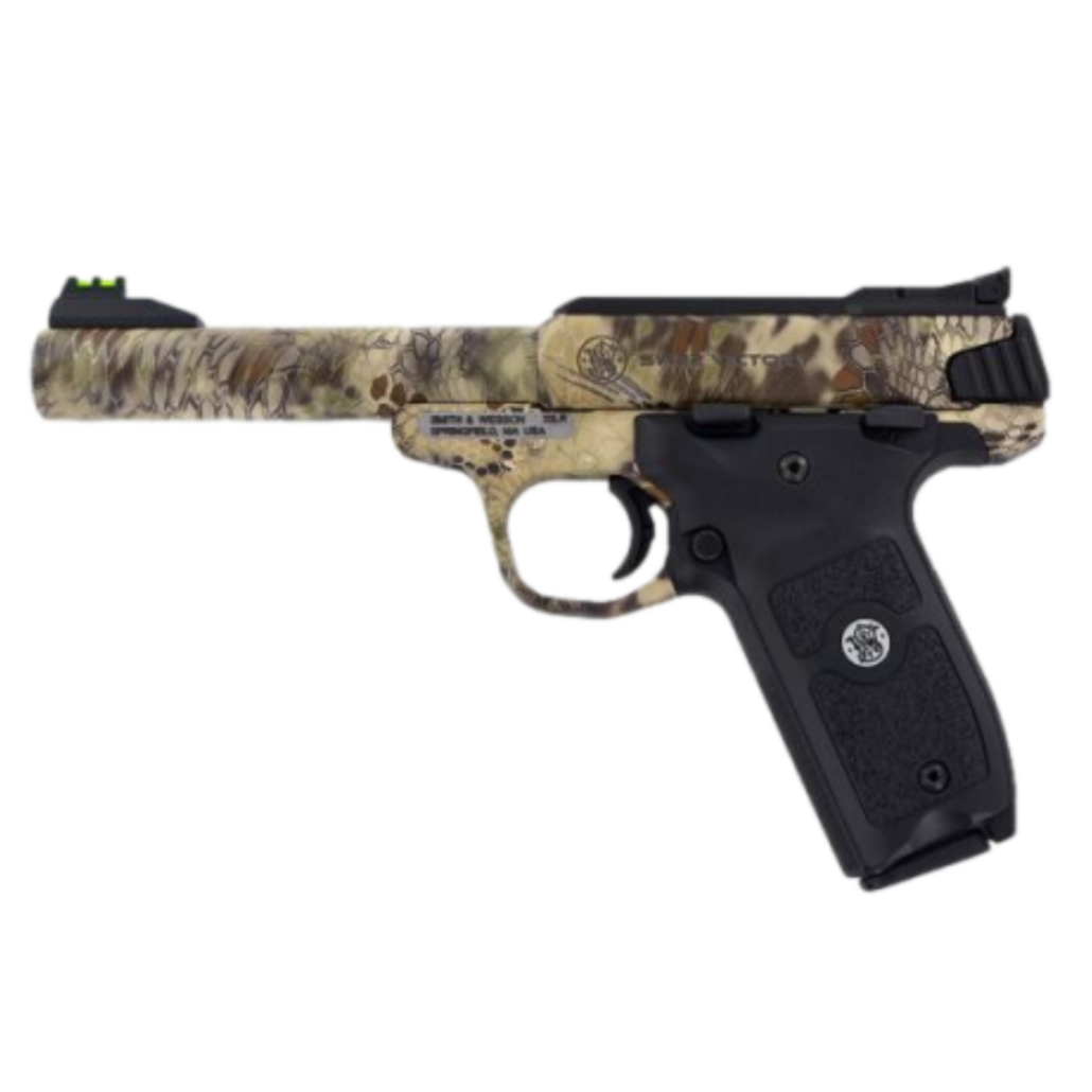 Calibre .22LR Gatillo regulable Cañón roscado de 5.5″ Alza regulable y guión de fibra óptica Terminación Cerakote Kryptek Capacidad de 10 tiros +1 Riel picattiny adicional Incluye dos cargadores